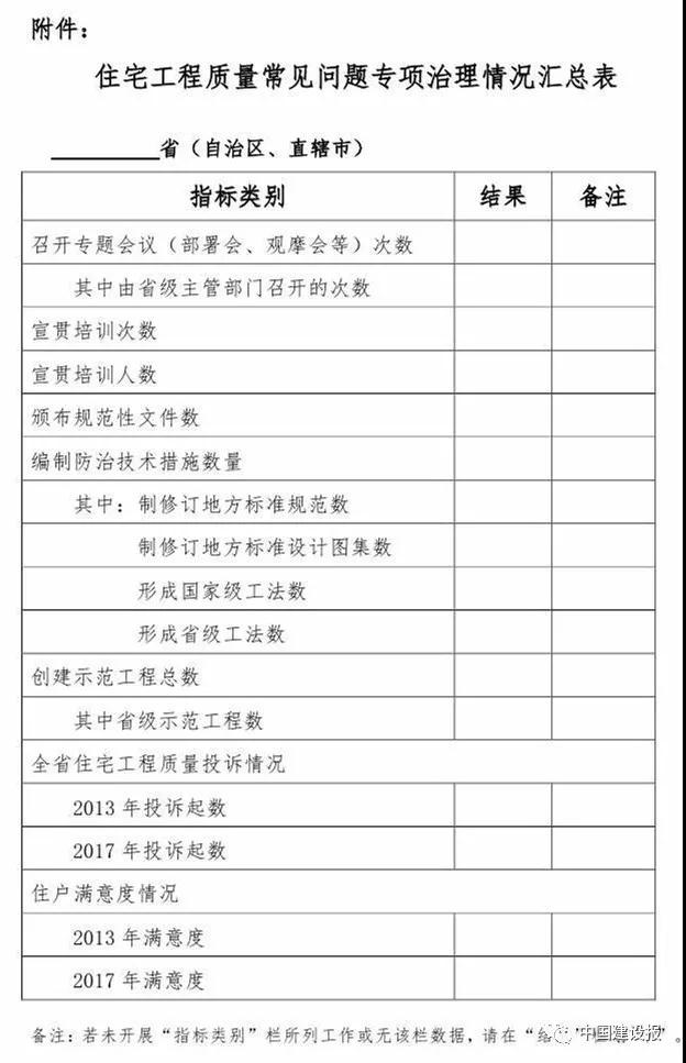 住建部日前印發(fā)通知,要求各地根據《住房城鄉(xiāng)建設部關于深入開展全國工程質量專項治理工作的通知》(后附),于2017年10月31日前將本地區(qū)住宅工程質量常見問題專項治理工作總結和情況匯總表(見下表)上報住建部工程質量安全監(jiān)管司。