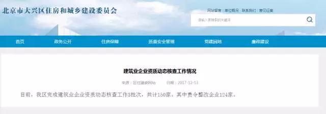 隨著建筑業(yè)企業(yè)資質(zhì)動態(tài)核查步入行業(yè)常態(tài)化。近日,北京市大興區(qū)對所區(qū)轄資質(zhì)管理150家企業(yè)進入全面效能核查。其中124家建企被責令整改!