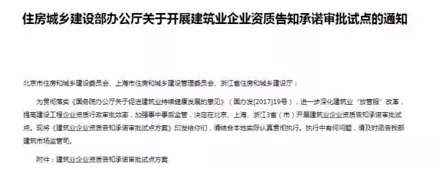 聯(lián)系到近日,住房和城鄉(xiāng)建設部頒布《關于開展建筑業(yè)企業(yè)資質(zhì)告知承諾審批試點的通知》,明確要求: