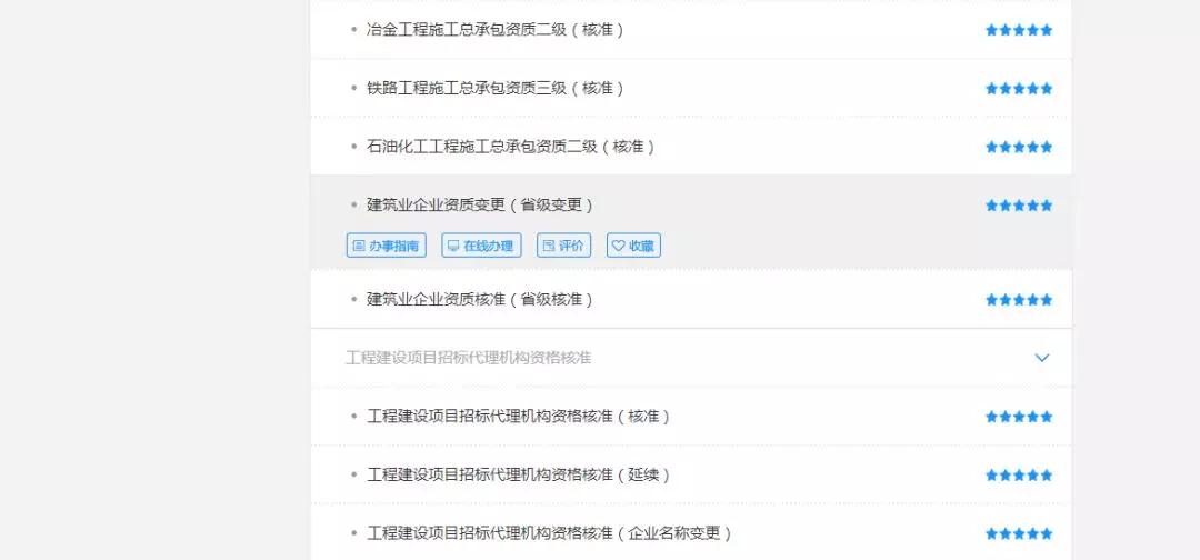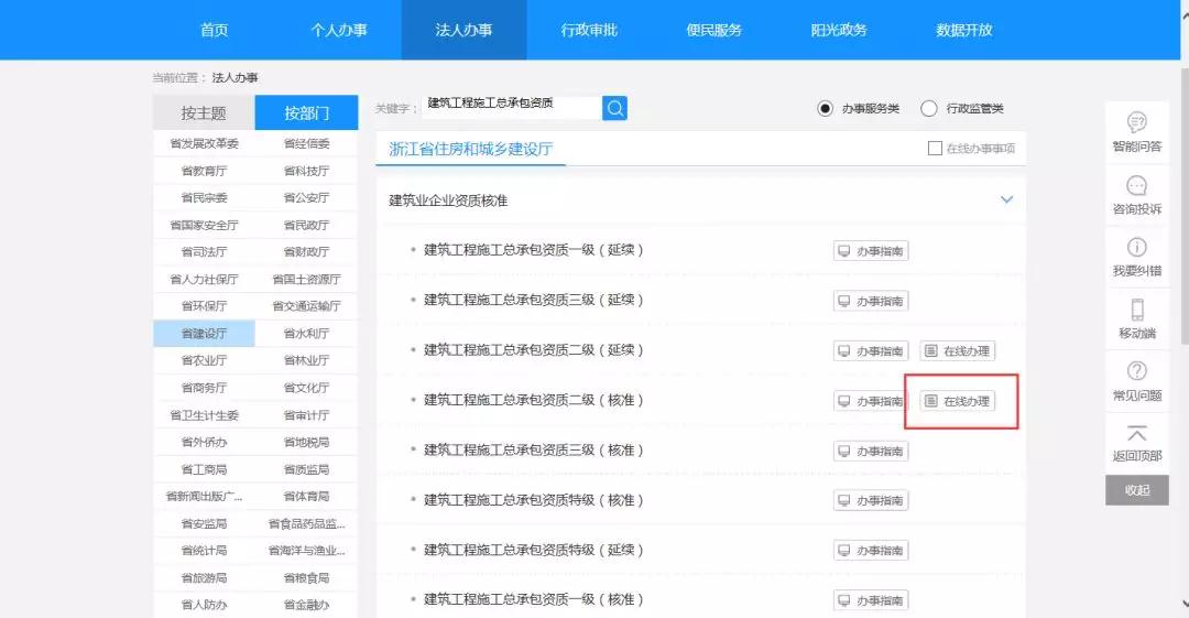 1、按照資質(zhì)申請(qǐng)操作步驟,點(diǎn)擊“法人辦事——按部門——省建設(shè)廳”進(jìn)入下圖界面,選擇建筑業(yè)企業(yè)資質(zhì)變更(省級(jí)變更)事項(xiàng),點(diǎn)擊“在線辦理”按鈕,進(jìn)入企業(yè)網(wǎng)上“操作流程”。(圖示如下)