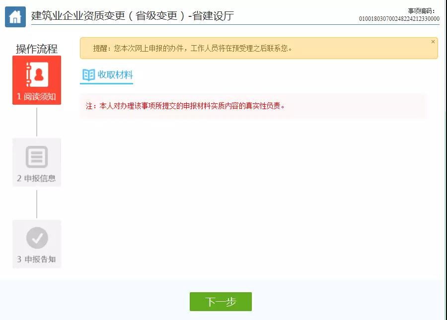 2、上一步操作后,網(wǎng)頁將自動(dòng)跳轉(zhuǎn)進(jìn)入企業(yè)“操作流程—1閱讀須知”界面,企業(yè)在閱知“收取材料”提示后,點(diǎn)擊“下一步”按鍵,進(jìn)入“操作流程—2申報(bào)信息”環(huán)節(jié)。由于建筑業(yè)企業(yè)資質(zhì)變更事項(xiàng)已采用智能化審批,不需要企業(yè)提交其余材料,該步驟直接點(diǎn)擊“下一步”即可。(圖示如下)