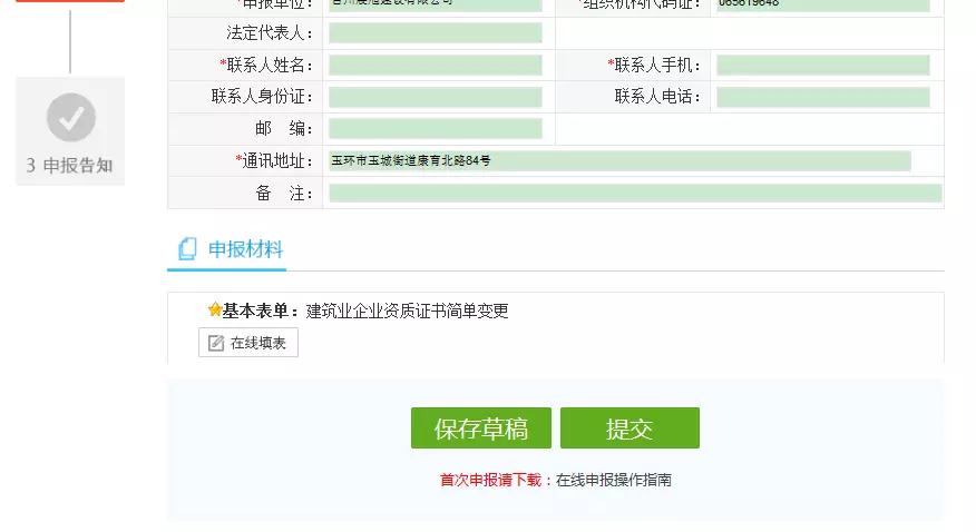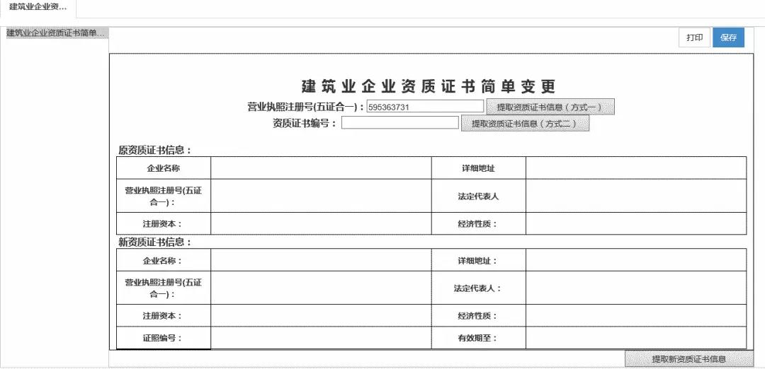 4、點(diǎn)擊在線填表頁面將跳轉(zhuǎn)至“建筑業(yè)企業(yè)資質(zhì)證書簡(jiǎn)單變更”,在表格內(nèi)點(diǎn)擊“提取資質(zhì)證書信息(方式一或二,建議使用方法一)”,進(jìn)行原資質(zhì)證書信息的提取(一般情況下建議采用方式一)。提取完成后,點(diǎn)擊表格右下方“提取新資質(zhì)證書信息”,完成新資質(zhì)證書信息的提取。確認(rèn)企業(yè)相關(guān)信息,點(diǎn)擊頁面右上方的“保存”和“提交”。(圖示如下)