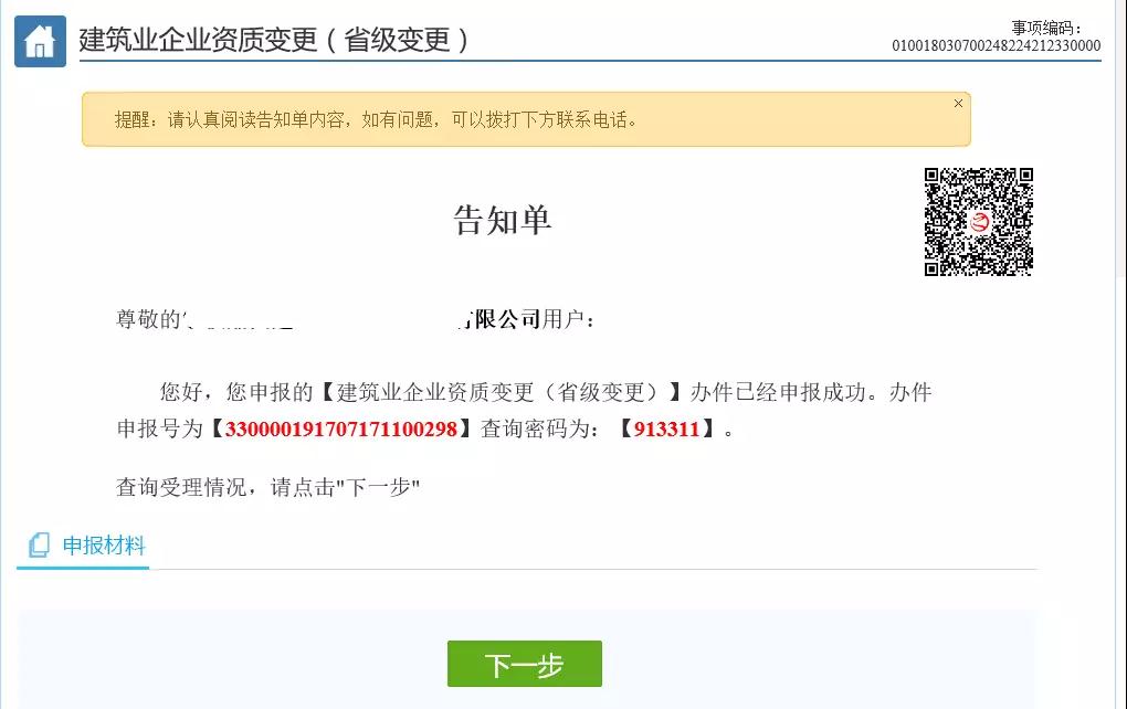6、上續(xù)操作后,網(wǎng)頁將自動(dòng)跳轉(zhuǎn)進(jìn)入企業(yè)“告知單”界面,請(qǐng)企業(yè)記錄《告知單》中的“辦件申報(bào)號(hào)”和“查詢密碼”,以便在本系統(tǒng)“辦事進(jìn)度”中進(jìn)行查詢。(圖示如下)