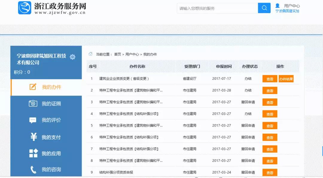 2、點(diǎn)擊左邊我的辦件找到當(dāng)即申報(bào)辦件,點(diǎn)擊右邊“辦件結(jié)果”。(如圖所示)