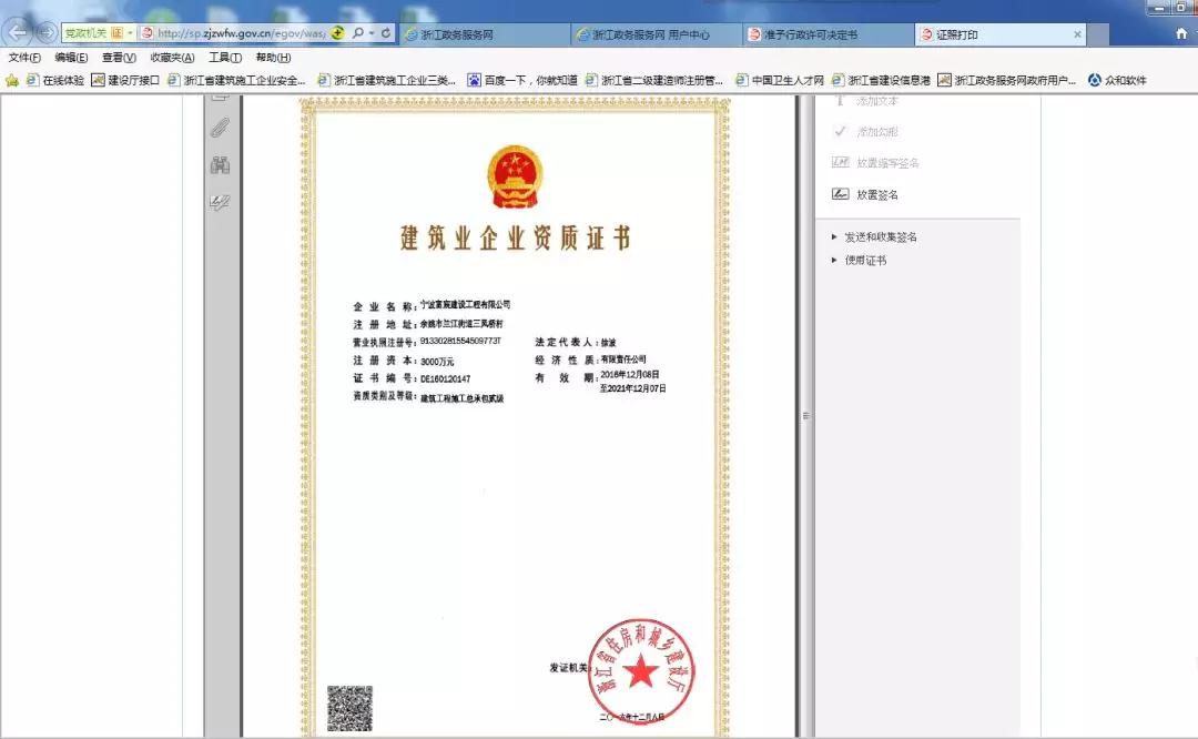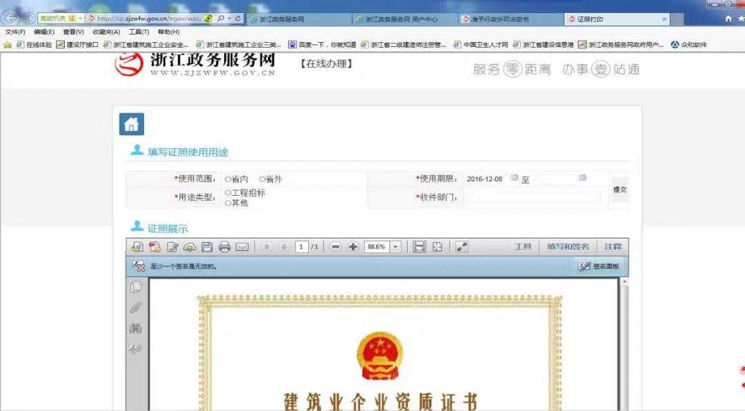 3、頁面跳轉(zhuǎn)至資質(zhì)證書界面,點(diǎn)擊證書上方打印按鈕即可打印證書。(如圖所示)