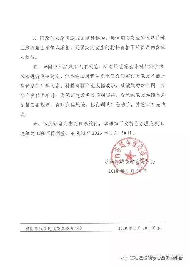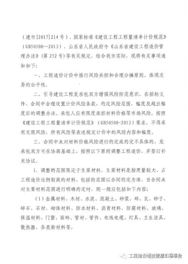 吉林省發(fā)文明確承包人采購材料和工程設備,合同中對材料和工程設備價格未明確風險范圍和超出風險范圍未明確調(diào)整辦法的,其主要材料和工程設備,價差在5%以內(nèi)(含5%)的,由施工單位承擔;超過5%以上部分的價差,由建設單位承擔。濟南市發(fā)文明確工程計價中應推行風險共擔和合理分攤原則,承包人應有限度承擔材料價格等市場風險諸多亮點。
