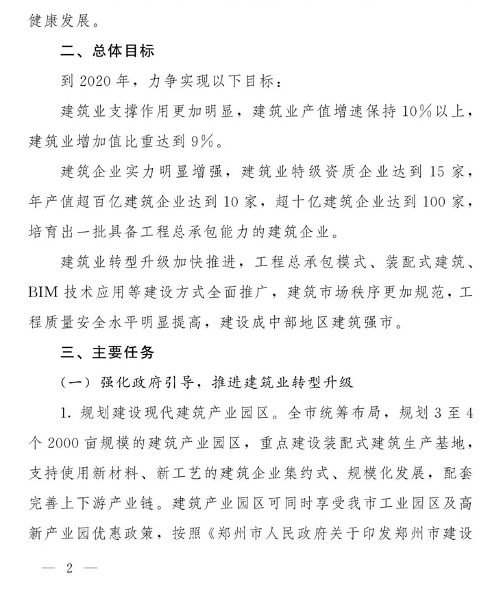 第二部分:總體目標(biāo)。力爭到2020年,實(shí)現(xiàn)三大目標(biāo):一是建筑業(yè)產(chǎn)值目標(biāo),建筑業(yè)產(chǎn)值增速保持10%以上,建筑業(yè)增加值比重達(dá)到9%;二是建筑企業(yè)做大做強(qiáng),特級資質(zhì)企業(yè)達(dá)到15家,年產(chǎn)值超百億建筑企業(yè)達(dá)到10家,超十億建筑企業(yè)達(dá)到100家;三是實(shí)現(xiàn)建筑業(yè)轉(zhuǎn)型升級,工程總承包模式、裝配式建筑、BIM技術(shù)應(yīng)用等建設(shè)方式全面推廣,建筑市場秩序更加規(guī)范,工程質(zhì)量安全水平明顯提高,建設(shè)成中部地區(qū)建筑強(qiáng)市。