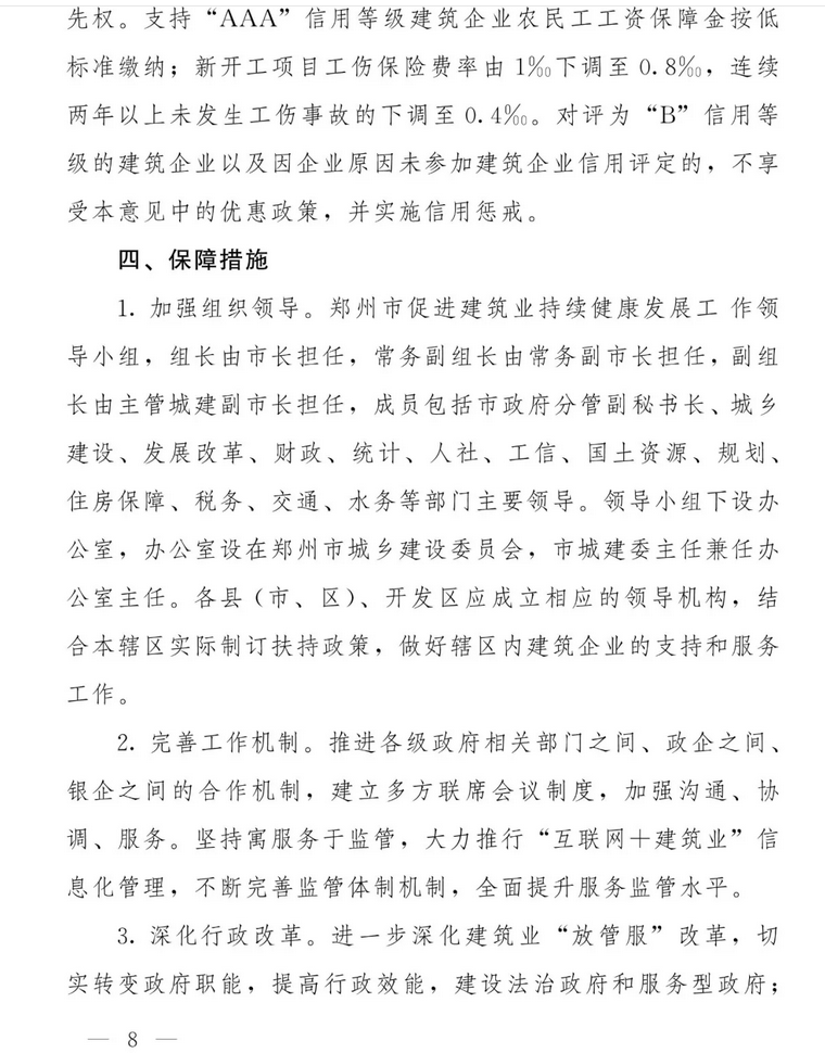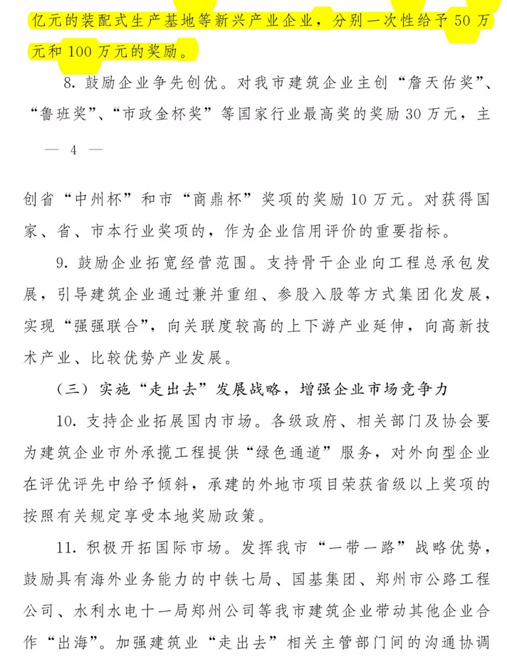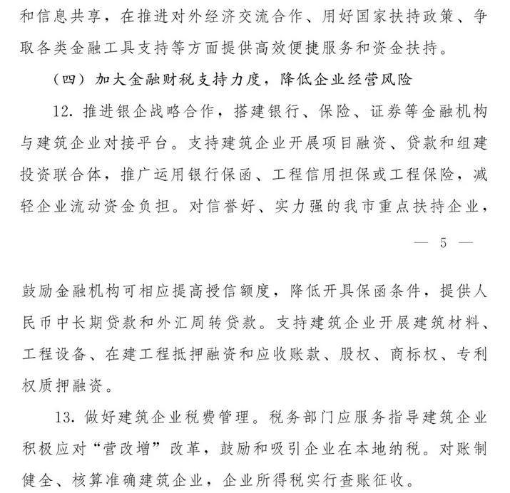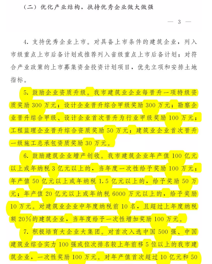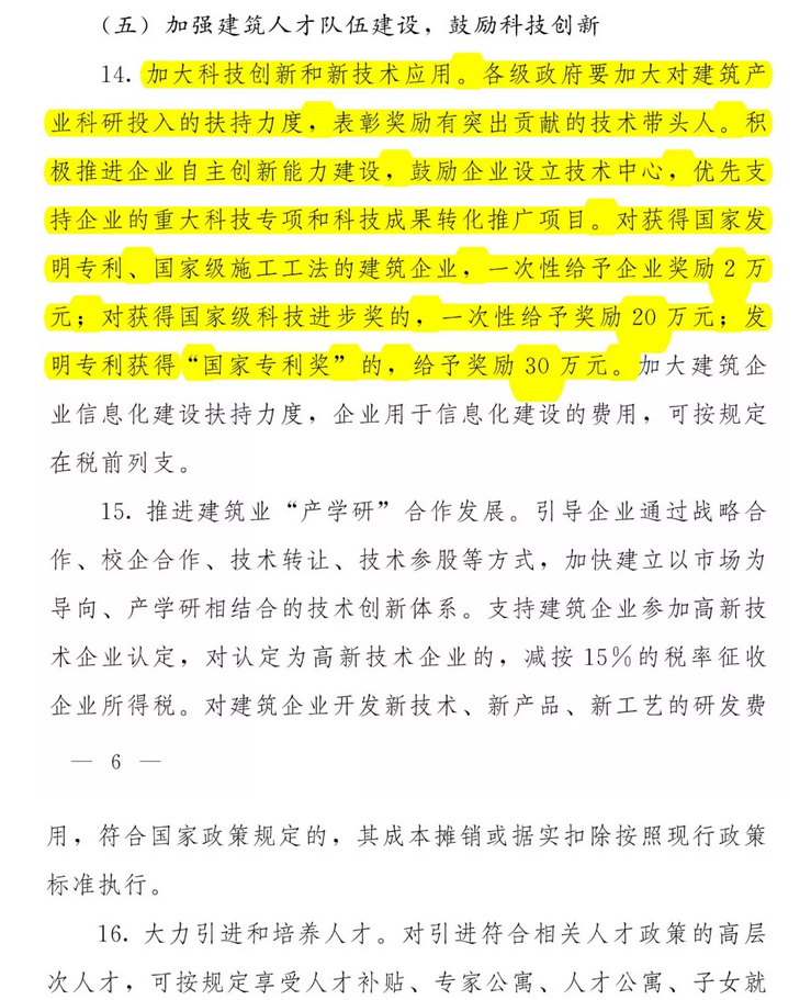 第三部分:主要政策內(nèi)容。共6部分18條。其中第一部分是“強(qiáng)化政府引導(dǎo),推進(jìn)建筑業(yè)轉(zhuǎn)型升級”,共3條;第二部分是“優(yōu)化產(chǎn)業(yè)結(jié)構(gòu),扶持優(yōu)秀企業(yè)做大作強(qiáng)”,共6條;第三部分是“實(shí)施“走出去”發(fā)展戰(zhàn)略,增強(qiáng)企業(yè)市場競爭力”,共2條;第四部分是“加大金融財(cái)稅支持力度,降低企業(yè)經(jīng)營風(fēng)險(xiǎn)”,共2條;第五部分是“加強(qiáng)建筑人才隊(duì)伍建設(shè),鼓勵(lì)科技創(chuàng)新”,共計(jì)3條;第六部分是“規(guī)范市場秩序,營造公平競爭的市場環(huán)境”,共計(jì)2條。