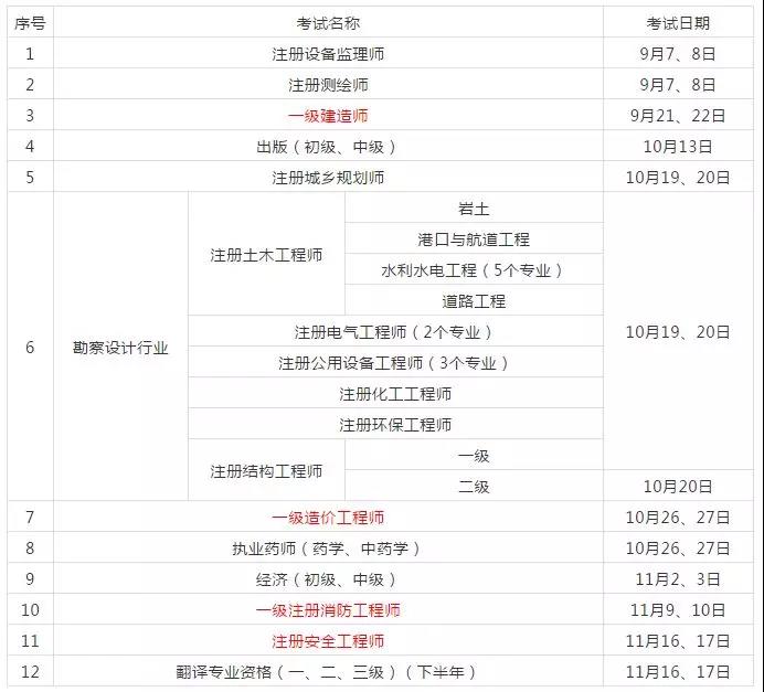 近日,中國(guó)人事考試網(wǎng)發(fā)布通知,明確:2019年下半年,由部考試中心負(fù)責(zé)組織實(shí)施的一級(jí)建造師考試等12項(xiàng)全國(guó)專(zhuān)業(yè)技術(shù)人員資格考試: