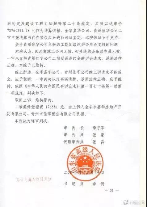 2016年12月17日,山東省高院民事判決書顯示,這場官司的結(jié)果是維持原判,原告浙江博元?jiǎng)僭V,被告金華嘉華和青州佳華向原告支付包含利息在內(nèi)的工程款約3500萬元,并駁回了青州佳華提出的浙江博元工期延誤的主張。陸曉東說,沒想到的是贏了官司,他們反而收到了一張要求支付工程款的執(zhí)行通知書。