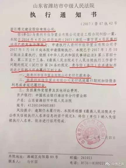 通知書顯示,2016年4月26號,由濰坊中院做出的濰民一重字第4號民事判決書已發(fā)生法律效力,也就是說浙江博元起訴青州佳華的一審判決生效。蹊蹺的是,執(zhí)行通知書是讓浙江博元向青州佳華支付工程欠款本金和利息。