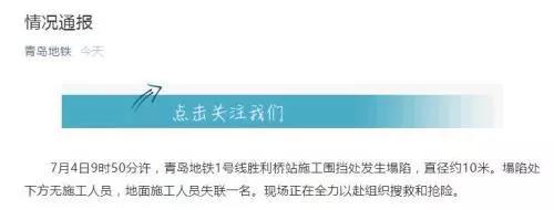 青島地鐵集團(tuán)4日發(fā)布情況通報(bào)稱,7月4日9時(shí)50分許,青島地鐵1號(hào)線勝利橋站施工圍擋處發(fā)生塌陷,直徑約10米。塌陷處下方無(wú)施工人員,地面施工人員失聯(lián)一名。