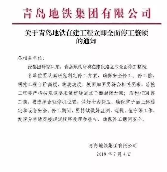 另據(jù)相關(guān)方面最新消息,青島地鐵當(dāng)日已經(jīng)下發(fā)通知立即全面停工整頓,涉所有在建線路,要求各單位研究制定停工方案,確保安全停工。