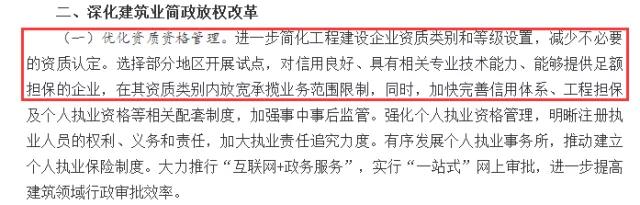 2017年2月24日,國(guó)務(wù)院辦公廳下發(fā)《關(guān)于促進(jìn)建筑業(yè)持續(xù)健康發(fā)展的意見》(國(guó)辦發(fā)〔2017〕19號(hào)),將“優(yōu)化資質(zhì)資格管理”作為首要事項(xiàng),放在文件“深化建筑業(yè)簡(jiǎn)政放權(quán)改革”的第一條,足見重視程度。