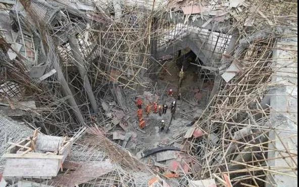 27日12時(shí)30分,18名施工人員完成框架柱、梁混凝土澆筑后即午間休息;13時(shí)30分,15名施工人員(另外3人未上塔樓屋頂)繼續(xù)澆筑屋面井字梁和屋面板;14時(shí)35分,框架柱、梁澆筑完成,屋面井字梁澆筑基本完成;在進(jìn)行第14車混凝土的澆筑時(shí)(10m3/車,總混凝土澆筑量約132m3),東南角模板突然出現(xiàn)坍塌,隨即整個(gè)模板支架系統(tǒng)快速向中部塌陷,所有屋頂施工人員隨坍塌的混凝土、鋼筋及模板支架系統(tǒng)一同墜落,并被坍塌物掩埋。