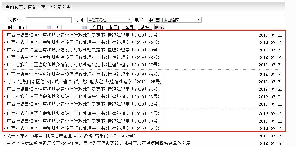 7月31日,廣西住建廳連續(xù)發(fā)布13條通報,對7起事故、致8人死亡的相關(guān)責(zé)任單位進行處罰。經(jīng)梳理,情況如下: