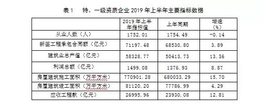 住房和城鄉(xiāng)建設(shè)部匯總的6552個特、一級資質(zhì)建筑業(yè)企業(yè)2019年上半年主要指標(biāo)數(shù)據(jù)如下(表1)。