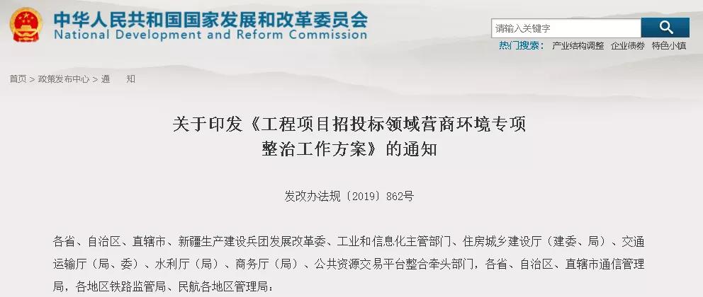 近日,國家發(fā)改委、住建部、工信部、交通部、水利部等八部門聯合下發(fā)通知,決定在全國開展工程項目招投標領域營商環(huán)境專項整治。