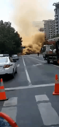 路面塌陷后,冒出黃色濃煙。隨后杭州地鐵官方微博也發(fā)布消息,稱(chēng)目前現(xiàn)場(chǎng)未發(fā)現(xiàn)人員傷亡,周邊人員已疏散,相關(guān)工作正積極展開(kāi)。