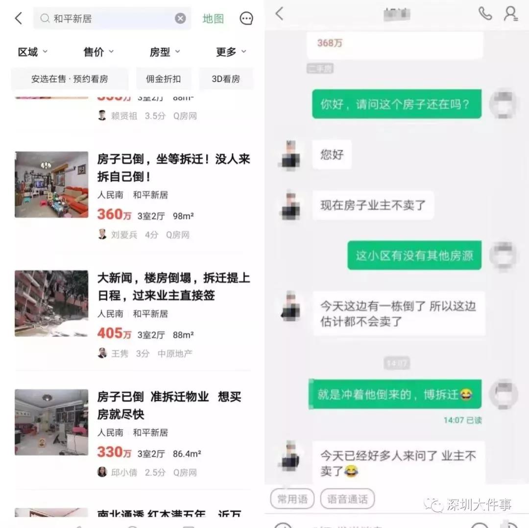 南都記者撥打電話向銷售人員咨詢,回復(fù)均為和平新居房子倒塌之后,業(yè)主立馬提價(jià)。“比如我手上這套房源原價(jià)350萬元,倒了之后,業(yè)主直接提價(jià)50萬,現(xiàn)在報(bào)400萬,而且是一口價(jià)。”銷售人員說道。