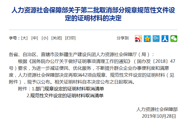 繼今年3月份人社部取消73項(xiàng)證明材料后,為進(jìn)一步減證便民、優(yōu)化服務(wù),近日人社部決定再取消42項(xiàng)證明材料:
