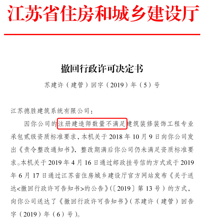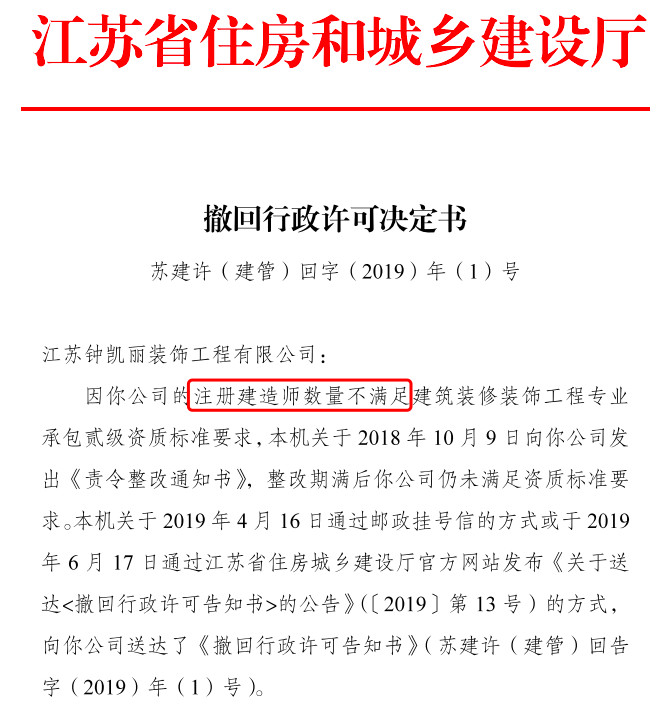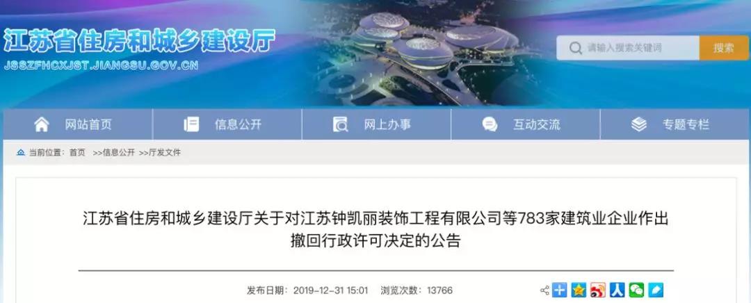 日前,江蘇省住建廳發(fā)布《關(guān)于對(duì)江蘇鐘凱麗裝飾工程有限公司等783家建筑業(yè)企業(yè)作出撤回行政許可決定的公告》。