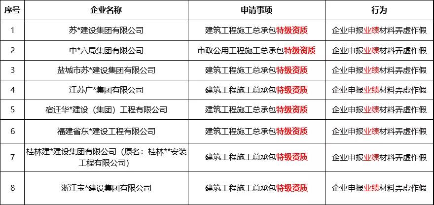經(jīng)查,*華建設(shè)集團有限公司等26家建設(shè)工程企業(yè)在資質(zhì)申報過程中存在弄虛作假行為;富*建設(shè)集團有限公司等8家企業(yè)在采用告知承諾制方式申報資質(zhì)過程中存在弄虛作假行為。根據(jù)《中華人民共和國建筑法》《中華人民共和國行政許可法》及《建設(shè)工程企業(yè)資質(zhì)申報弄虛作假行為處理辦法》(建市〔2011〕200號)等規(guī)定,決定對*華建設(shè)集團有限公司等34家建設(shè)工程企業(yè)予以通報批評,不批準(zhǔn)其資質(zhì)申請,并將其不良行為在全國建筑市場監(jiān)管公共服務(wù)平臺予以公布。自本通報印發(fā)之日起1年內(nèi)不受理上述企業(yè)申請相應(yīng)行政許可。