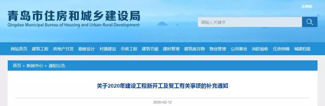 青島市住建局發(fā)布《關(guān)于2020年建設(shè)工程新開(kāi)工及復(fù)工有關(guān)事項(xiàng)的補(bǔ)充通知》,明確: