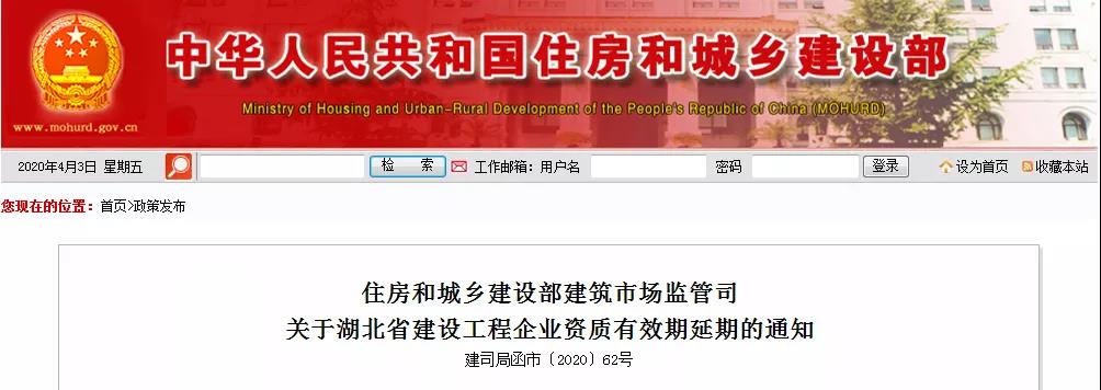 為幫助湖北省建設(shè)工程企業(yè)解決新冠肺炎疫情防控和企業(yè)生產(chǎn)經(jīng)營面臨的實際困難,確保湖北省建筑業(yè)平穩(wěn)運行,現(xiàn)決定,注冊地為湖北省的企業(yè)持有我部核發(fā)的工程勘察、工程設(shè)計、建筑業(yè)企業(yè)、工程監(jiān)理企業(yè)資質(zhì),有效期于2020年9月30日前期滿的,統(tǒng)一延期至2020年10月31日。相關(guān)建設(shè)工程企業(yè)資質(zhì)有效期將在全國建筑市場監(jiān)管公共服務(wù)平臺自動延期,資質(zhì)證書無需換發(fā),在此期間仍可用于工程招標投標等活動。