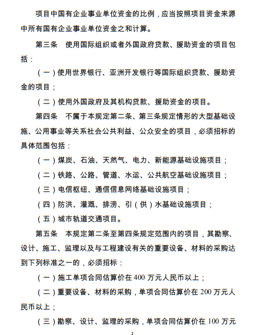 《必須招標(biāo)的工程項(xiàng)目規(guī)定》第一條 為了確定必須招標(biāo)的工程項(xiàng)目,規(guī)范招標(biāo)投標(biāo)活動(dòng),提高工作效率、降低企業(yè)成本、預(yù)防腐敗,根據(jù)《中華人民共和國(guó)招標(biāo)投標(biāo)法》第三條的規(guī)定,制定本規(guī)定。第二條 全部或者部分使用國(guó)有資金投資或者國(guó)家融資的項(xiàng)目包括:(一)使用《預(yù)算法》規(guī)定的預(yù)算資金200萬(wàn)元人民幣以上,并且該資金占投資額10%以上的項(xiàng)目;(二)使用國(guó)有企業(yè)事業(yè)單位資金,并且該資金占控股或者主導(dǎo)地位的項(xiàng)目。新增:上款中規(guī)定的“占控股或者主導(dǎo)地位”,包括以下三種情形:(一)項(xiàng)目中使用國(guó)有企業(yè)事業(yè)單位資金占總投資額百分之五十以上;(二)項(xiàng)目中使用國(guó)有企業(yè)事業(yè)單位資金雖然不足總投資額百分之五十,但國(guó)有企事業(yè)單位依其出資額所享有的表決權(quán)已足以對(duì)有關(guān)項(xiàng)目建設(shè)的決議產(chǎn)生重大影響;(三)國(guó)有企業(yè)事業(yè)單位通過(guò)投資關(guān)系、協(xié)議或者其他安排,能夠?qū)嶋H支配項(xiàng)目建設(shè)。項(xiàng)目中國(guó)有企業(yè)事業(yè)單位資金的比例,應(yīng)當(dāng)按照項(xiàng)目資金來(lái)源中所有國(guó)有企業(yè)事業(yè)單位資金之和計(jì)算。第三條 使用國(guó)際組織或者外國(guó)政府貸款、援助資金的項(xiàng)目包括:(一)使用世界銀行、亞洲開(kāi)發(fā)銀行等國(guó)際組織貸款、援助資金的項(xiàng)目;(二)使用外國(guó)政府及其機(jī)構(gòu)貸款、援助資金的項(xiàng)目。第四條 不屬于本規(guī)定第二條、第三條規(guī)定情形的大型基礎(chǔ)設(shè)施、公用事業(yè)等關(guān)系社會(huì)公共利益、公眾安全的項(xiàng)目,(一)煤炭、石油、天然氣、電力、新能源基礎(chǔ)設(shè)施項(xiàng)目;(二)鐵路、公路、管道、水運(yùn)、公共航空和A1級(jí)通用機(jī)場(chǎng)等交通運(yùn)輸基礎(chǔ)設(shè)施項(xiàng)目;(三)電信樞紐、通信信息網(wǎng)絡(luò)基礎(chǔ)設(shè)施項(xiàng)目;(四)防洪、灌溉、排澇、引(供)水基礎(chǔ)設(shè)施項(xiàng)目;第五條 本規(guī)定第二條至第四條規(guī)定范圍內(nèi)的項(xiàng)目,其勘察、設(shè)計(jì)、施工、監(jiān)理以及與工程建設(shè)有關(guān)的重要設(shè)備、材料等的采購(gòu)達(dá)到下列標(biāo)準(zhǔn)之一的,必須招標(biāo):(一)施工單項(xiàng)合同估算價(jià)在400萬(wàn)元人民幣以上;(二)重要設(shè)備、材料的采購(gòu),單項(xiàng)合同估算價(jià)在200萬(wàn)元人民幣以上;(三)勘察、設(shè)計(jì)、監(jiān)理的采購(gòu),單項(xiàng)合同估算價(jià)在100萬(wàn)元人民幣以上。本規(guī)定第二條至第四條規(guī)定范圍內(nèi)的項(xiàng)目,其勘察、設(shè)計(jì)、施工、監(jiān)理以及與工程建設(shè)有關(guān)的重要設(shè)備、材料的采購(gòu)未達(dá)到上款相應(yīng)標(biāo)準(zhǔn)的,該單項(xiàng)采購(gòu)不屬于本規(guī)定的必須招標(biāo)范疇。