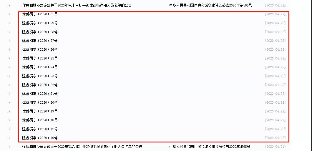4月22日,住建部官網(wǎng)連續(xù)下發(fā)15份處罰,均為事故追責(zé)。分別為1家施工單位、1家監(jiān)理單位、7名項目總監(jiān)、5名項目經(jīng)理、1名項目負責(zé)人。