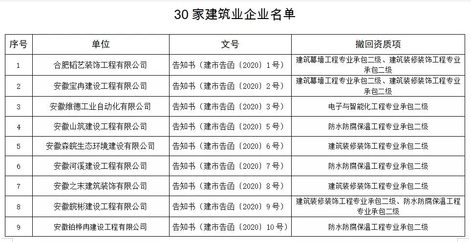 5月9日,安徽省住建廳發(fā)布了《關(guān)于撤回30家建筑業(yè)企業(yè)資質(zhì)證書的通報(bào)》和《關(guān)于對9家建筑業(yè)企業(yè)撤回建筑業(yè)企業(yè)資質(zhì)的公告》。