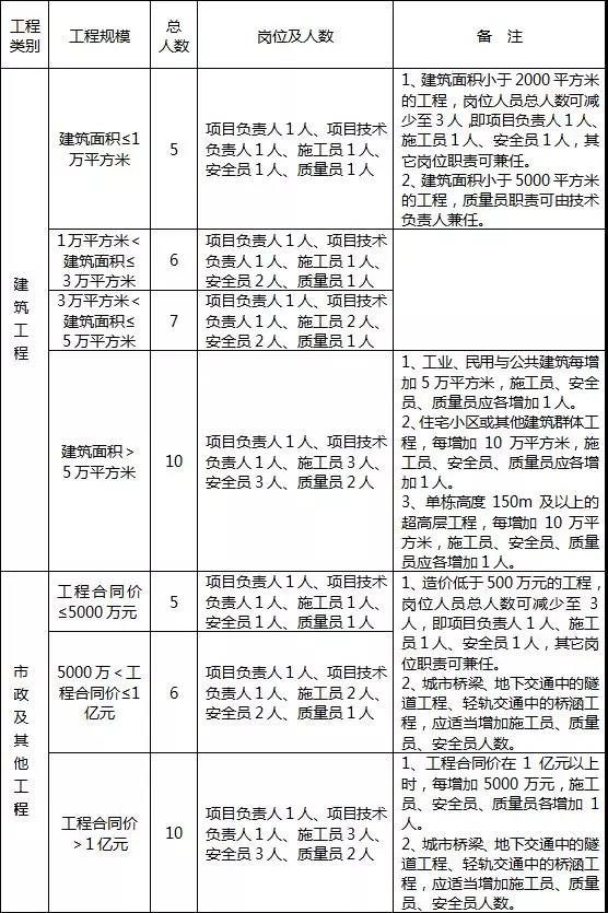 3、對(duì)于復(fù)雜的體育場所、綜合性工程以及工期較緊、多班施工作業(yè)的工程,在以上配備標(biāo)準(zhǔn)基礎(chǔ)上應(yīng)適當(dāng)增加施工員、質(zhì)量員、安全員人數(shù)。