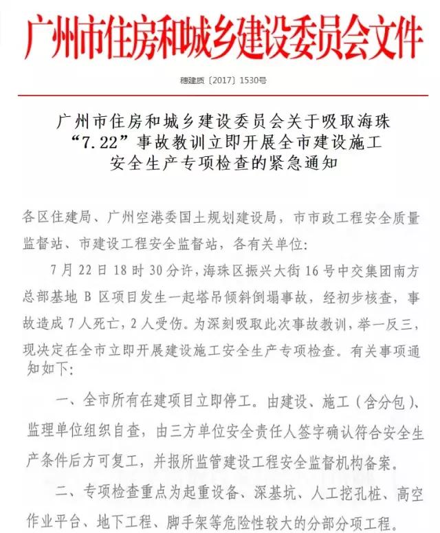 記者23日從廣州市住建委官網(wǎng)獲悉,《廣州市住房和城鄉(xiāng)建設(shè)委員會關(guān)于吸取海珠“7·22”事故教訓(xùn)立即開展全市建設(shè)施工安全生產(chǎn)專項(xiàng)檢查的緊急通知》(以下簡稱“《緊急通知》”)公布。廣州市住建委以海珠“7·22”事故為教訓(xùn),決定在全市立即開展建設(shè)施工安全生產(chǎn)專項(xiàng)檢查。其中,《緊急通知》提出,廣州所有在建項(xiàng)目立即停工。